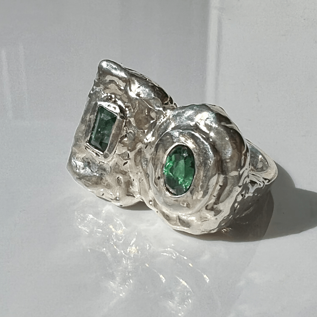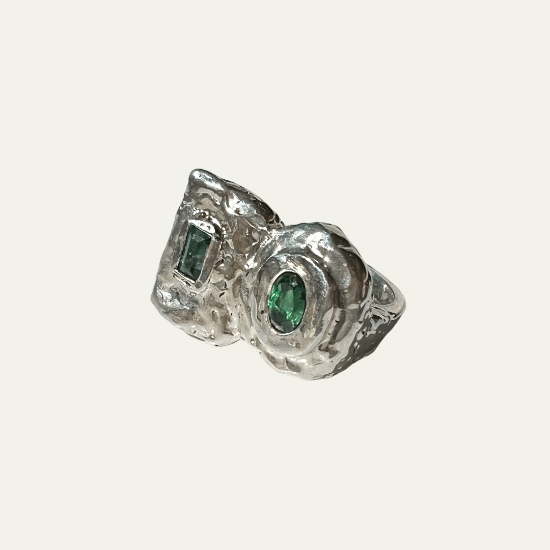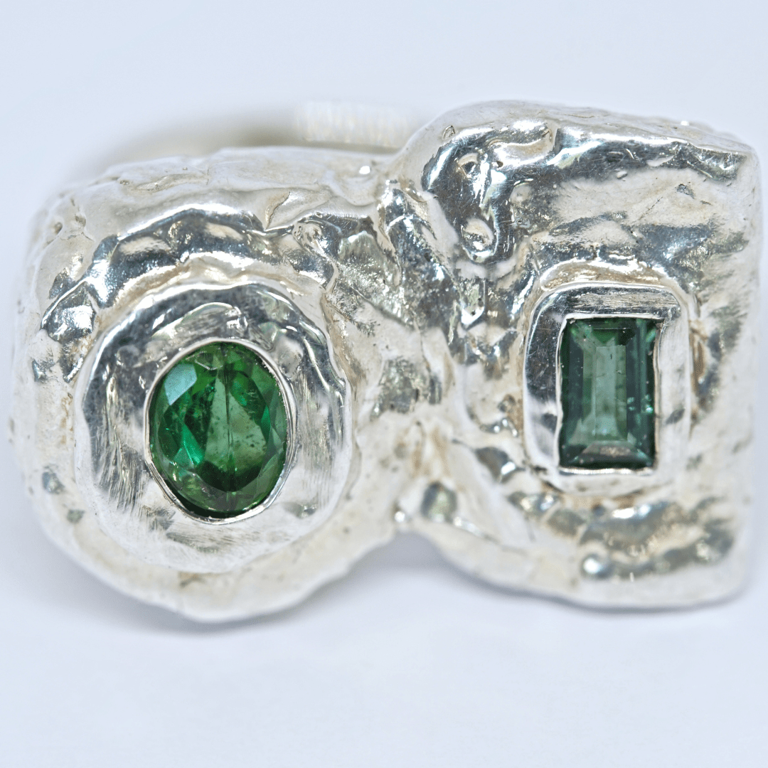 Anillo en plata 9.25 y baño de oro de 22K con Turmalina verde.
